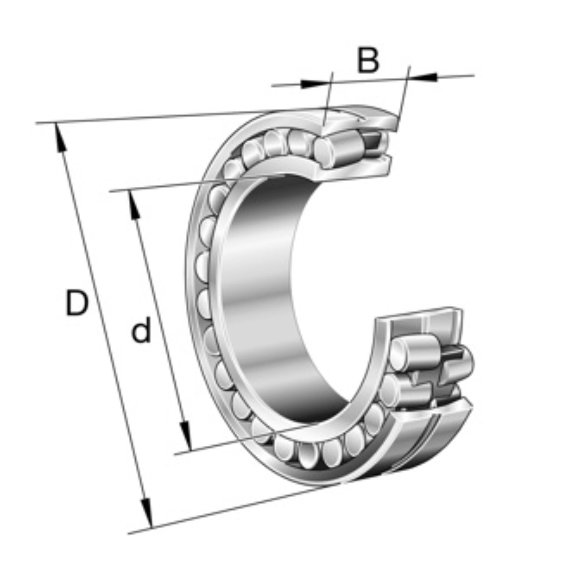 This spherical roller bearing has a solid inner ring, which runs on two rows of symmetrical rollers in a solid outer ring. The outer ring has a concave, spherical raceway. This design compensates for any alignment errors and shaft deflections.