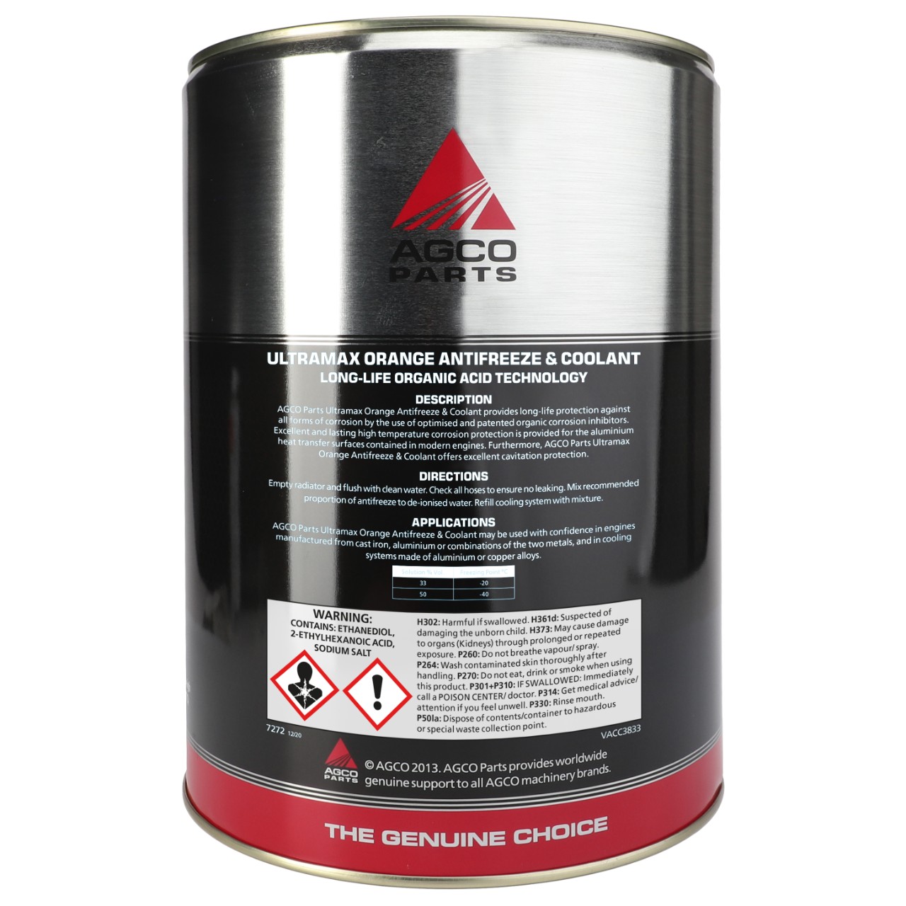 AGCO Parts UltraMax Orange Antifreeze and Coolant is a heavy-duty product for use in engines manufactured from cast iron or aluminium and in cooling systems made of aluminium or copper alloys.